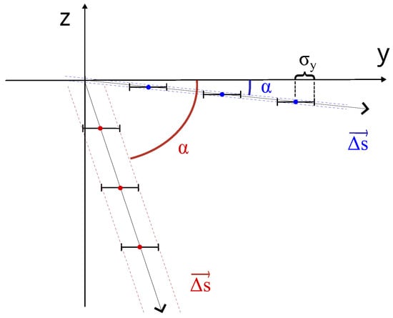 The results are reported in Figure 5. Concerning the dependence on , when the oscillation occurs vertically (), the uncertainty of the angle is at its maximum, and it tends to decrease as the oscillation becomes horizontal up to the minimum for . Similarly, the larger the displacement, the smaller the uncertainty of the angle . As a first impression, these facts could seem a bit surprising; however, the explanation relies on the fact that for this specific geometry, . In fact, this leads the uncertainty of the horizontal axis to contribute much more to the dispersion of the vertical displacements rather than the horizontal ones, thus introducing uncertainty in the retrieval of the angle. The concept is emphasized by the scatter plot in Figure 6, in which two examples of displacement with different directions are reported in the plane. For the sake of clarity, is considered to be zero in the plot.