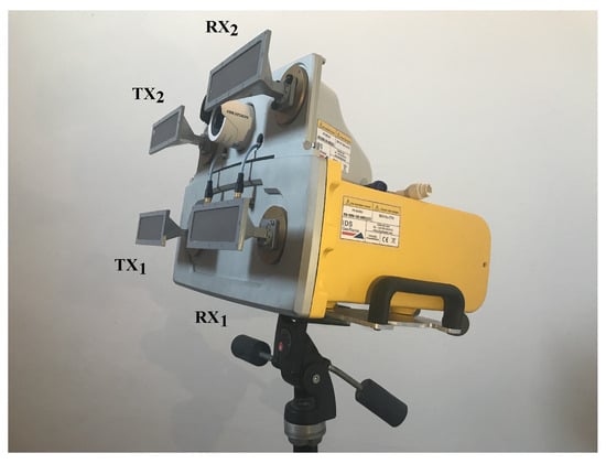 The radar used in this work was a modified version of the IBIS-FM MIMO by IDS Georadar (Pisa, Italy) [,], and it is shown in Figure 7. It provides an FMCW signal with central frequency GHz, bandwidth MHz, and . With these parameters, the unambiguous range was about m, the range resolution m, and the pulse repetition frequency Hz.