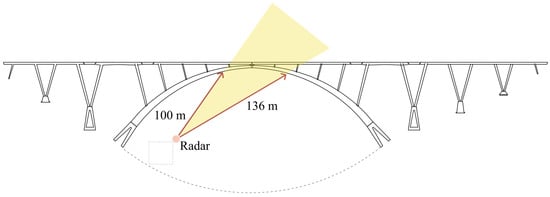 As mentioned above, the bridge considered in this work is arched; the horizontal deck is connected to the arch by some oblique uprights. A first monostatic measurement was carried out so as to capture the oblique uprights and the deck. The schematic of the setup is shown in Figure 9.The radar setup used in this measurement was the one shown in Figure 7. The radar was placed on a small hill under the bridge; the area separating it from the bridge was clear. It is worth mentioning that the schematic is in scale. In Figure 10a is shown a picture of the radar while operating in the monostatic configuration. In Figure 10b is shown a picture of the Bisantis bridge.