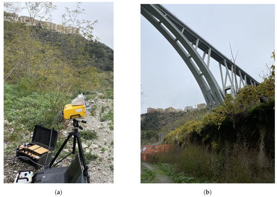 The bridge’s name is Bisantis; it is located in Catanzaro, Italy, and it was designed by the best-known Italian civil engineer Riccardo Morandi in the early sixties. Over the same years, the engineer also designed the Polcevera bridge, which fell in 2018. After its tragic collapse, synthetic aperture radar (SAR) data collected from satellites up to 2018 were used to detect possible precursors [,,]. Similar SAR techniques were applied to the Bisantis bridge, thereby leading to the detection of the vibration amplitude pattern of the deck []. The Bisantis bridge is an arched bridge made by reinforced concrete: the horizontal deck is connected to the arch by some oblique uprights. The first design of the bridge included two central support pillars; however, this was later avoided because the foundation soil at the bottom of the valley was alluvial, while that of the walls was solid rock. A draft of the bridge is shown in Figure 1. The bridge is about m high with a maximum span of m. The width is m, and the length is m. Due to the arch, this bridge is extremely rigid in the vertical direction, while it should have a large displacement component along the transversal direction on the horizontal plane due to the strong wind blowing in the gully during the measurement sessions.