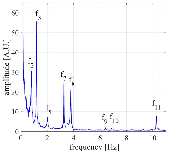 The JTFA [] of the displacement was performed, and the results are reported in Figure 13. The frequencies identified were about eight in all, which are listed in Table 1 (the frequencies were numbered with reference to the results shown in the following subsection).