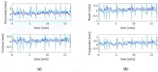 The displacement components of the bridge were calculated by means of Equation (6). The cumulative displacements were then computed and reported in Figure 16 as functions of time. The horizontal component results were much larger than the vertical ones, as is evident from Figure 16a. In particular, the first exceeded mm approximately at the minutes 0.2, 1.7, 6.8, 12.4, 13.8, and 15, while the second remained bounded in ≈1.5 mm during the entire measurement. In Figure 16b are reported the displacements detected by the radar and the transponder.