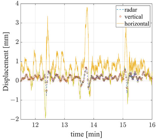 To better appreciate the contribution of the multimonostatic approach with respect to the standard monostatic one, in Figure 17 are reported the displacement values retrieved from the single measurement, namely the radar, and the ones retrieved from the double measurements, namely the vertical and the horizontal measurements. The data were reported from about the 11th min up to the 16th min for better clarity of the comparison. It is worth noting that, given the adopted geometry, the displacement retrieved from the radar coincides with the vertical displacement retrieved from the double measurement radar–transponder. The horizontal displacement results were about four times higher than the vertical ones.