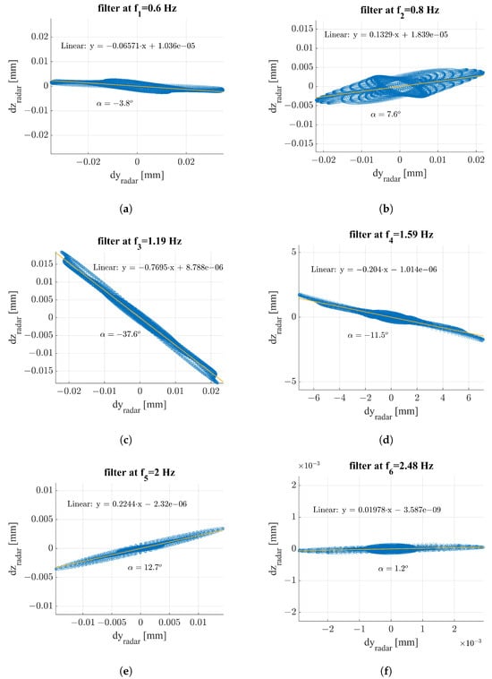 Deep insights into the multimonostatic results are provided by retrieving the displacements directions. A significant time period was selected on the displacement data. On the data were applied six band-pass Butterworth filters with 15 poles, with each centered on a specific natural frequency , where ; the results were reported as scatter plots in the y–z plane. A linear fit was carried out for each of the six groups of data, and the angle was retrieved from the angular coefficient of the fitting lines. A potential source of errors in this evaluation is given by the presence of different displacement directions overlapped between themselves. However, in this work, the main purpose of this procedure was to highlight the preferential tendency of most of the displacements, thus providing more concreteness to the results of the previous subsections.