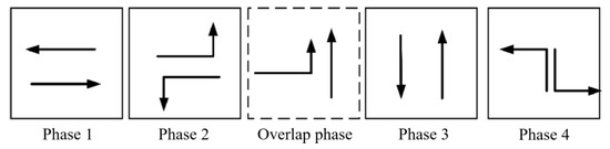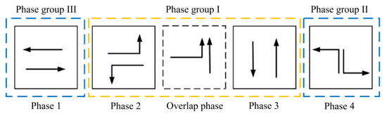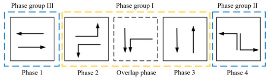 The design of the post-transition signal scheme is the first step, taking into account the change in the phase scheme of the phase sequence. Next, the signal transition scheme is determined. The phases before and after the overlap phase are considered phase group I, while the remaining phases are designated as phase group II and phase group III. In the case of tidal lanes with symmetric release scheme for NT traffic flow, the key traffic flow combination in phase group I consists of NT + WL or ST + EL. The key traffic flow combination in phase group II comprises NL or SL, and in phase group III, it is WT or ET, as stated by Peng and Zhang (2001) [39]. The schematic diagram of overlap phase group is shown in Figure 10.
