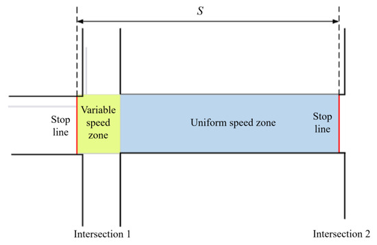 where v2 represents the design speed of the road section. tcha refers to the travel time in the variable speed zone. scha indicates the distance of the speed zone, which represents the length of the intersection. a represents the acceleration of the vehicle in the variable speed zone.