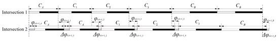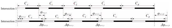 Phase offset includes relative offset and absolute offset [5,45,46]. In practical coordination of traffic control, relative offset is commonly utilized. This refers to the time that passes between the start of a green light or the end of a red light at two adjacent intersections in an arterial intersection. The symbol (ζ) represents this offset, which can be measured either in seconds (s) or as a percentage of the cycle length. The phase offset calculation equation in Webster‘s model is defined as Equations (34) and (35).