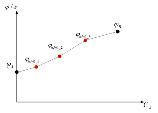 where represents the traffic flow ratio of the post-transition stream m, represents the traffic flow ratio of the pre-transition stream m, N represents the number of cycles of signal transition, N + 1 indicates the number of changes from the pre-transition to the post-transition cycle. Additionally, represents the traffic flow ratio of the m-stream of the kth transition cycle. represents the traffic flow ratio of the m-stream of the k − 1th transition cycle. equals when k = 1 (usually, the traffic flow ratio is taken with an accuracy of 0.01, therefore, the adjustable range is adopted as 0.01).