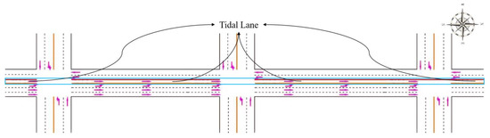 The optimal utilization of spatiotemporal resources in the tidal lane and its adjacent intersections is a crucial area of advancement in tidal lane research. Tidal lanes significantly affect the competence and effectiveness of adjacent intersections during switching, necessitating modifications to the intersection’s original signal timing schema. In order to avoid disruption to the normal operation of the road network when switching signal timing schemes, it is necessary to implement traffic signal transition control at intersections. The traffic signal transition control scheme facilitates the transition from one signal timing scheme to another at intersections. During the transition process, the transition scheme incorporates certain parameters from the previous timing scheme. This involves adjusting the signal phase or green light duration over one or several signal cycles to facilitate the switch to the new timing scheme. Consequently, the effectiveness of traffic control is directly affected by the traffic signal transition control scheme. Hamilton (2007) proposed an arterial fast transition method to analyze the possible impact on the original signal scheme due to signal scheme switching [1]. Pohlmann and Friedrich (2010) presented an additional transition method based on investigating transition effects in a meshed network with different coordinated relations [2]. Lee et al. (2012) proposed a non-linear mathematical model that provides constrained delay minimization through incremental and simultaneous adjustments in offset and cycle length during plan transitions [3]. Qin and Khan (2012) proposed two control strategies of traffic signal timing transition to reduce the response time and minimize the impact of emergency vehicle operation on general traffic [4]. Rita et al. (2017) presented an alternative and new mathematical model to enhance the performance of traffic signals coordination at intersections during the transition phase [5]. Zheng et al. (2017) developed an improved empirical transition method with the goal of reducing the time spent on offset correction and the offset deviations of the coordinated phases during the transition period [6]. Yao et al. (2018) established a multi-objective signal recovery transition optimization model based on the power function method [7]. Joyo et al. (2020) proposed an intelligent traffic-lights management system by exploiting relationship between traffic lights’ duration and transition pattern [8]. Zheng et al. (2021) proposed a reasonable transition method for yellow light signals and help formulate customized training programs for different types of drivers [9]. Mussa and Selekwa (2021) presented a signal timing transition period based on the quadratic optimization method [10]. Liu and Gayah (2022) proposed a travel-delay based Max Pressure model to generate lower delay with traffic transition [11]. Bouyahia et al. (2022) presented a novel prediction algorithm according to the impact of incorporation of traffic switching processes [12]. Li et al. (2022) proposed a novel approach using the FCA data for traffic congestion detection and signal transition scheme [13]. Lu et al. (2022) proposed an algebraic method of regional green wave coordinated control that can operate efficiently [14]. Storani et al. (2022) proposed a hybrid traffic flow model using signal transition to connect signalized arterial [15]. Guerra et al. (2022) compared this with a pre-timed coordinated signal control scheme, they proposed an algorithm that enabled a smooth transition to the traffic system target scheme [16]. Moradi et al. (2023) used information of connected vehicles to estimate the saturation flow rate during the transition period [17].