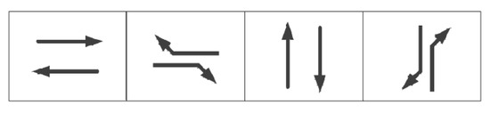 This paper focuses on arterial signal intersections with independent right-turning traffic flow. At these intersections, the right-turning traffic does not have separate signal control. However, the effect of the right-turning traffic flow on the original straight direction of traffic flow on the road it occupies and the straight traffic flow in the lane it turns into does not need to be taken into account. Under the given setting conditions, the flow direction grouping can be divided into eight sections, which can be represented by the vector U in Equation (1).