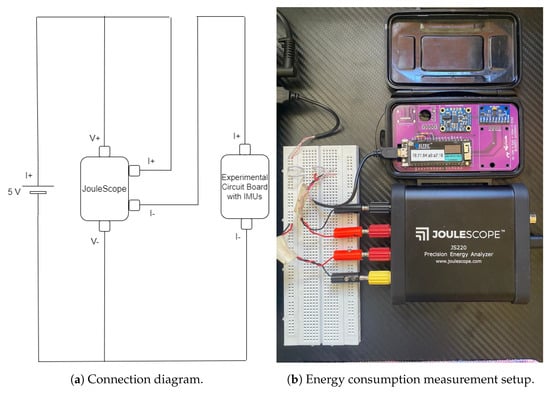 In this Section, we gauge the power increase incurred by the use of the attitude estimate routines presented in this article. To assess the power consumption, we used the Joulescope (see Figure 3b), which is a precision measuring instrument boasting a resolution of 0.5 nA and a bandwidth of 300 kHz, capable of handling 2 million samples per second [37]. The measurement circuit design is depicted in Figure 3a.