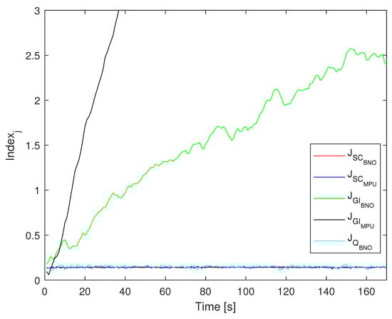 In this analysis, we identify the attitude estimate routines using lettered subscripts for differentiation, A refer to the measurement algorithms executed with data obtained from the MPU9250, while B is for those executed with data acquired from the BNO055. The subscripts indicate the following cases: