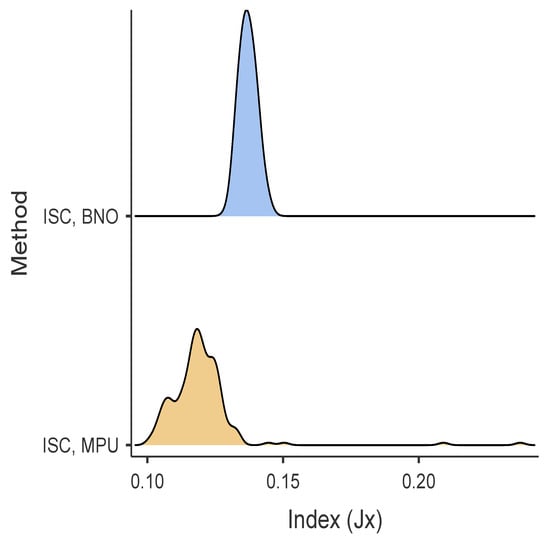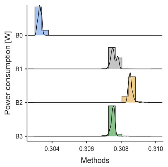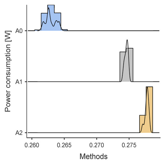 Table 6 resumes the obtained power consumption results [mW] obtained in the tests described in Section 4.4. Figure 7 and Figure 8 show the power consumption distributions for BNO055 and MPU9250, respectively. Furthermore, the results using the statistical software JAMOVI [38] of the non-parametric tests indicate that there are statistically significant differences between the algorithms for the BNO055 and MPU9250 () and effect size estimates, Cohen’s d, ( = 0.8538) for BNO055 and ( = 0.8881) for MPU9250, which is considered a large effect according to Cohen’s standards.