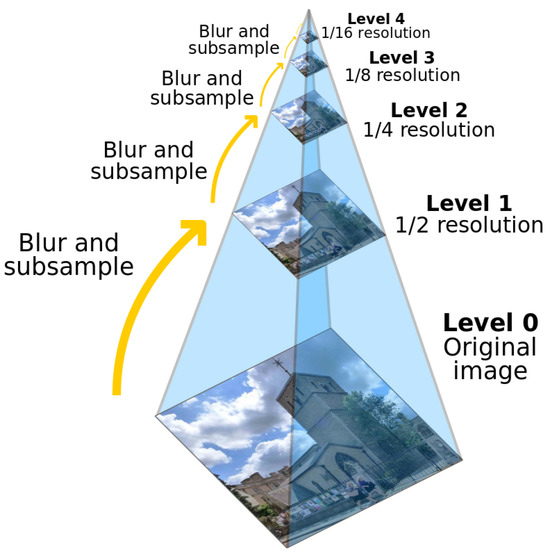 An “image pyramid” is a multi-scale image representation in which the bottom layer of the image structure is the original image and each layer up is obtained by performing a series of downsampling and filtering operations on the next layer. Each layer of the pyramid is obtained by blurring and downsampling the previous layer, thus preserving the features of the image at different scales.