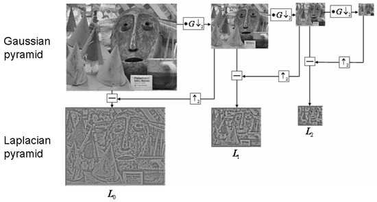 Gaussian pyramid downsampling is first performed with Gaussian blur and then downsampling. The image only contains low-frequency information except for the resolution reduction. The Laplacian pyramid firstly subtracts the source image (the Gaussian pyramid downsamples the low-frequency image), then enlarges the image to extract the high-frequency residual, samples the source image by Gaussian pyramid downsampling, and then reconstructs (restores) the image by upsampling. The process is shown in Figure 3.
