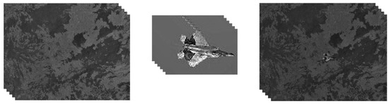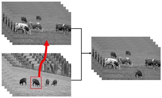 The resolution of the background video of the plane flying video is 640 × 480, and the video resolution of the aircraft target is 100 × 80. The resolution of the background video of the cone flight video is 800 × 600, the resolution of the target video is 512 × 512, and each video has 150 frames. The video editing processes are shown in Figure 8 and Figure 9. The resolutions of the background and target video of the cattle and goat video are both 3840 × 2160, and the fused video has 500 frames. The process is shown in Figure 10.