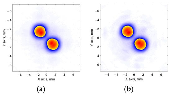 where and are steering angles. For the TFM, these angles can be assumed as 0. Equation (14) can be used to obtain the beam directivity diagram of the considered matrix phased array configuration. This diagram can be used to evaluate the imaging performance of the considered 2D probe layout. An example of the beam directivity diagram obtained using Equation (13) is shown in Figure 3.