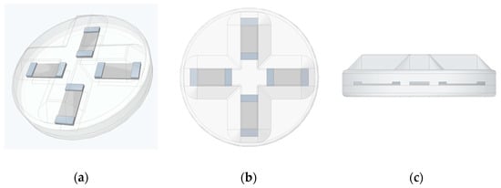 The proposed flexible 3D force sensor’s CAD design (a), top view (b), and side view (c).