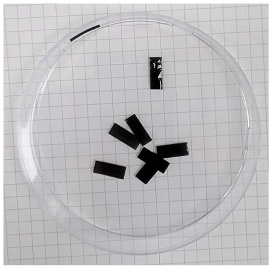 The MWCNT/PVDF nanocomposite was selected as the sensing elements of the proposed flexible 3D force sensor. Solution mixing and spray coating techniques were used to fabricate the strain sensing elements, as described in the literature [32,43]. The PNC-CNT films with lower CNT concentrations result in high electrical resistance films, which lead to more complex signal conditioning than metallic strain gauges [42]. As a result, 4 wt. % of MWCNTs (20 mg) were chosen and mixed with 50 mL of N-N dimethylformamide (DMF) to ensure the CNTs’ dispersion and avoid CNTs aggregation. The mixture was placed in a sonication path for 30 min at room temperature. At the same time, 0.5 g of PIVDF was dissolved in 5 mL of DMF and mixed in a magnetic stirrer for three hours at a temperature of 80°. Then, the two mixtures were blended at room temperature until a homogenous solution was achieved. The resultant solution was sprayed on glass substrates using an airbrush at room temperature. The MWCNT/PVDF sensing elements were peeled off the substrates by immersion in the sonication bath. The average thickness of the resulting films was measured at approximately 26 μm. Finally, the resulting films were placed on a hot plate at 80° to enhance the solvent evaporation. Four sensing elements were cut to be implemented in the developed flexible 3D force sensor as their sensing elements, as shown in Figure 2.