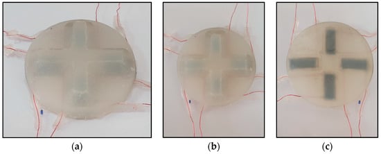 First, the silicone rubber mixture EcoflexTM 00-03, Smooth-On, Inc., Macungie, PA, USA, was prepared and poured into the lowered mold until it was filled, and it was left to cure for 24 h at room temperature. Then, the four sensing elements were allocated based on the cross-beam structure configuration 3D force sensor, as shown in Figure 3b. Enameled copper magnet wires with a diameter of 0.2 mm were fixed to the lower mold at the ends of each sensing element, as shown in Figure 3c. The wires’ coating was removed at contact points with each sensing element’s ends. The AA-DUCT 916 Flexible Silver Epoxy Adhesives (Atom Adhesives) electrodes were deposited at the ends of the sensing elements’ wires for measurement. The upper mold was set above the lower one and filled with the silicone rubber mixture again, as shown in Figure 3d. The copper wires were permitted to exit the upper mold through small side gaps. The molded flexible 3D force sensor was set at room temperature for 24 h until fully cured. Finally, the 3D force sensor was removed from the mold, and excessive materials were trimmed, as shown in Figure 4.