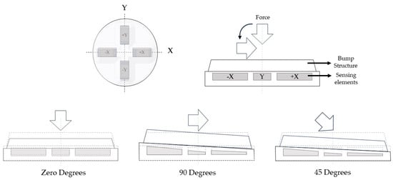 The flexible 3D force sensor was tested at different force angles: 90°, 45°, and zero degrees. The sensor’s operation principle is illustrated in Figure 5. The bump structure is compressed at the normal force condition, and the four-sensing element experiences symmetrical deformation. When the bump structure experiences torque due to the applied shear force at an angle of 90° (shear force), the +X sensing element will be compressed while the −X sensing element is stretched. At the same time, the Y-sensing elements will experience the shear force effect in the +X axis direction. On the other hand, when an inclined force with an angle of 45° is applied to the flexible 3D force sensor, it will lead to the combined effect of both normal and shear force components. The compression and tension strain affect the CNTs’ positioning and resistivity. The MWCNTs get closer when the sensing element is under compression. As a result, more electrical connective channels are formed, and the sensing elements’ resistance decreases. In contrast, the resistivity of the sensing elements increases when they starch due to the MWCNTs moving further from each other.