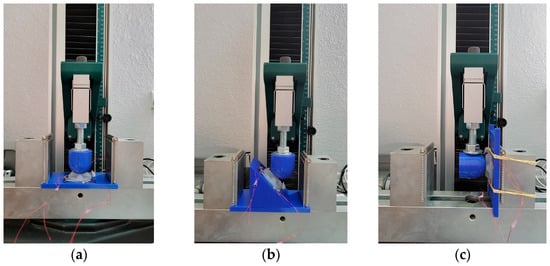 The flexible 3D force sensor’s performance and sensitivity were investigated under static and dynamic loading using a tensile/compression testing machine. The fabricated sensor was tested at different force angles: 90°, 45°, and zero degrees. These angles were measured between the loading direction and the sensor’s Z axis, as shown in Figure 6. Two PLA-loading spherical heads with a diameter of 40 mm were constructed using 3D printing technology and attached to the machine’s load cell using bolts and nuts. The first loading head was constructed to align with the machine load cell alignment for the zero and 45° loading tests, as shown in Figure 6a,b. On the other hand, the second loading head was attached perpendicular to the loading machine’s load cell to ensure 90° angle loading with the sensor’s Z axis, as shown in Figure 6c. Regarding the flexible 3D force sensor fixture, two 3D-printed fixture holders were designed to hold the sensor fixed during testing. The first flat holder attached to the machine clamping system at two different angles in the zero and 90° testing, as shown in Figure 6a,c. A 45° holder was combined with the former holed to maintain the sensor at the same angle during the sensor examination, as shown in Figure 6b.