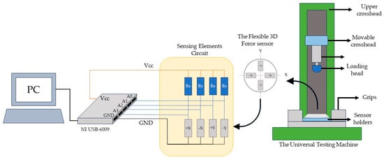 For the static testing, the applied force was increased gradually from 0 N to 25 N in the zero degree and 45° loading testing scenarios in the −Z axis and X axis directions, respectively. A maximum loading of 12 N was applied at the 90° testing setup in the −X axis direction. The relationship between the voltage readings of the four distributed sensing elements and the applied forces was retrieved and plotted. On the other hand, a dynamic loading with an acceleration of 0.167 mm/sec was applied to the flexible 3D force sensor. The sensor experienced loading forces in the same assigned direction for each setup, except for a different initial load that was applied to the sensor before testing to ensure complete contact between the loading head and the 3D flexible force sensor. A maximum loading of 22 N was applied in the −Z and X directions with angles of 0° and 45°, respectively. In the force shear loading test with an angle of 90° in the −X direction, the maximum applied force was 10 N. Four pairs of simple voltage dividers signal conditioning circuits were used to measure sensing elements’ resistance changes under applied external forces, as shown in Figure 7. The resistance Rs were selected to be equal to the paired sensing element to achieve high-sensitivity measurements. The voltage measurements of the four sensing elements circuit were acquired using a data acquisition (DAQ) system from National Instruments and presented using LabVIEW 2020 software. The sensing element voltage signals were sampled at a frequency of 1000 Hz, and a low pass filter with a cutoff frequency of 100 Hz was utilized to eliminate higher-frequency noise.
