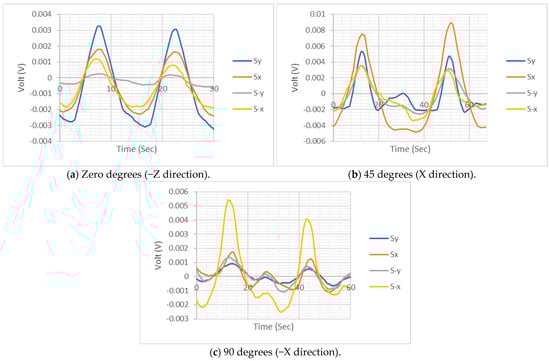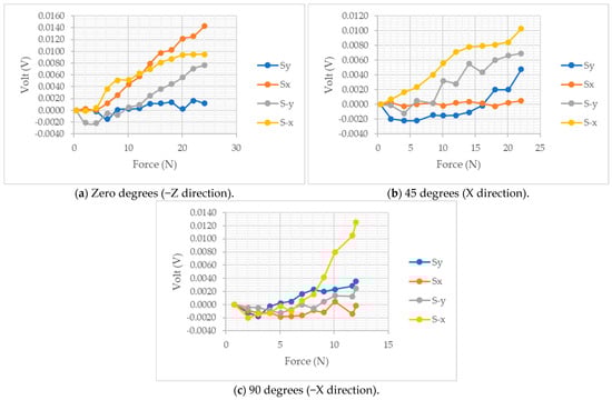 The proposed sensor experienced static loading forces in three different directions at different engagement angles, and measurements were retrieved, as shown in Figure 8. The DC gains were removed from the voltage readings of the four sensing elements. Normal compression forces from 0 N to 22 N were applied to the sensor’s center, and all voltage readings were recorded, as shown in Figure 8a. The sensing elements at the +X axis recorded the highest sensitivity of 7 × 10−4 Volt/N. Meanwhile, the sensing elements at −X and −Y axes measured the force changes with a slightly lower sensitivity of 5 × 10−4 Volt/N and 4 × 10−4 Volt/N, respectively. On the other hand, the sensing element at the +Y axis was the least sensitive to the force changes with a sensitivity of 8 × 10−5 Volt/N; however, it still demonstrated an increase in pressure.