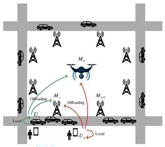 Figure 1, which consists of a UAV in the air and RSUs deployed on the ground as the MEC servers to provide computing resources, and pedestrians and vehicles as users. UAV improves its service quality by moving in the air to cater to users’ computing demands. The RSUs, equipped with computing resources, provide seamless communication and computing service coverage for vehicles and pedestrians on the road. We can express all MEC servers, UAV and RSUs, as