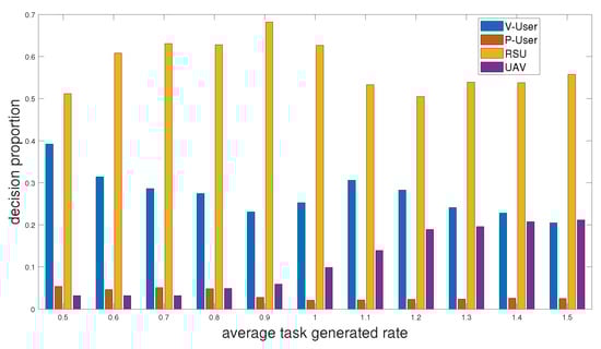 Figure 3 shows the distribution of offloading decisions made by the proposed scheme under different average task generated rates. The value of the average task generated rate ranges from 0.5 to 1.5, meaning the average of the number of tasks generated per user at the beginning of each time slot. We can see that as the average task generated rate increases, the offloading decision falls more and more on the UAV, but, overall, RSU is always the main choice for offloading tasks.