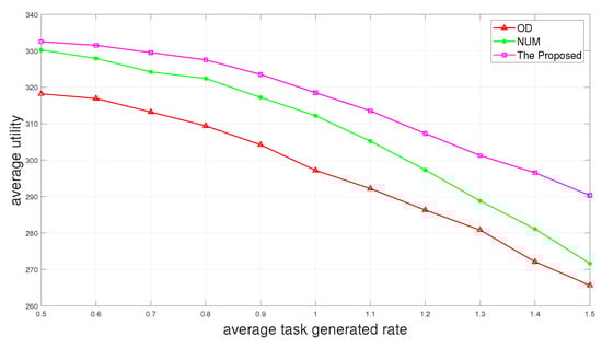 Figure 4, we evaluate the performance of the proposed two-layer scheme “The Proposed” with “NUM” and “OD” as a function of average task generated rate. We can observe that the average utility decreases as the average task generated rate increases. It is because the larger the average task generated rate is, the more tasks are generated at time slot