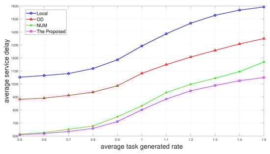 Figure 5 that the average service delay increases as the average task generated rate increases. The average service delay of “Local” is undoubtedly the largest, and the scheme of only performing the first layer of offloading decision “OD” is slightly smaller than it. The proposed two-layer scheme performs the best. The scheme “NUM” with no UAV movement performs almost the same as the proposed scheme when the average task generated rate is small. It is because there are fewer tasks generated at this time, and we can observe in