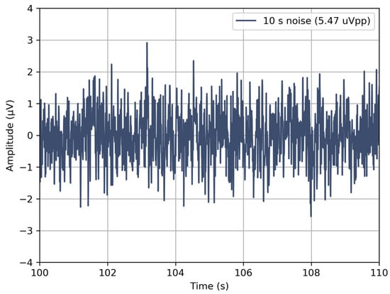 Input-referred noise within acquisition bandwidth: All the four electrodes were short-circuited, and ten measurements (see Figure 5d), each lasting 10-s, were performed. The acquired signals were filtered using a first-order Butterworth filter with a cut-off frequency of 0.5 Hz and 50 Hz, as described in the EEG medical device standard [13], and peak-to-peak values were recorded. The input-referred noise was calculated considering the gain and ADC conversion factors, and it was found to be less than 5.5 µV peak-to-peak (Figure 6), again satisfying the requirement.