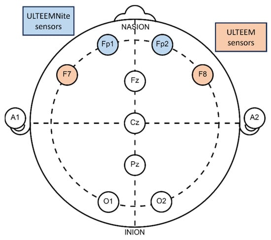 Placement of ULTEEM and ULTEEMNite devices with respect to the international 10–20 system. Position of ULTEEM device is marked with orange and of ULTEEMNite device with blue.