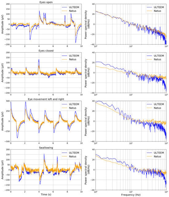 (Left column) Comparison of time-domain signals acquired under four different settings (eyes open, eyes closed, eyes moving to the left and right, and swallowing action while eyes are open) by the ULTEEM device (blue curve) and the reference EEG device (Natus SleepWorks) which uses gel electrodes (orange curve). (Right column) Comparison of frequency spectra of the corresponding time-domain signals for each action.