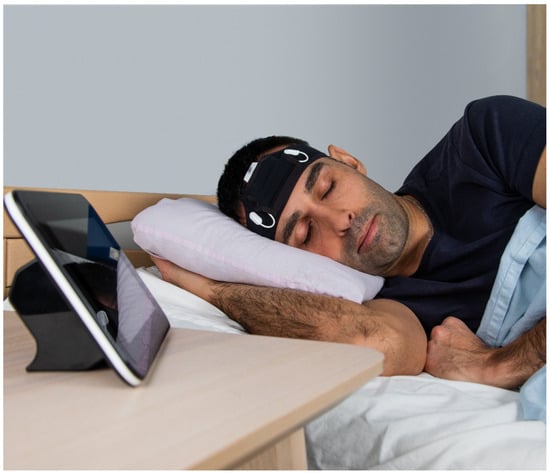 The ULTEEMNite device was tested by a healthy proband for a night-long recording to assess its capability to detect typical macro- and micro-sleep EEG characteristics. Figure 9 shows a representative home recording setup, with the ULTEEMNite system inserted in a headband and placed onto the forehead. In this configuration, the ULTEEMNite device acquires a signal between the so-called Fp1 and Fp2 locations, as defined by the international 10–20 system (Figure 7). In Figure 10, a time-domain and a multi-taper spectral domain method were used to clearly visualize the dynamics of the five recorded sleep cycles. Furthermore, EEG signals from different non-rapid eye movement (non-REM) sleep stages are displayed, illustrating the high quality of the recording.