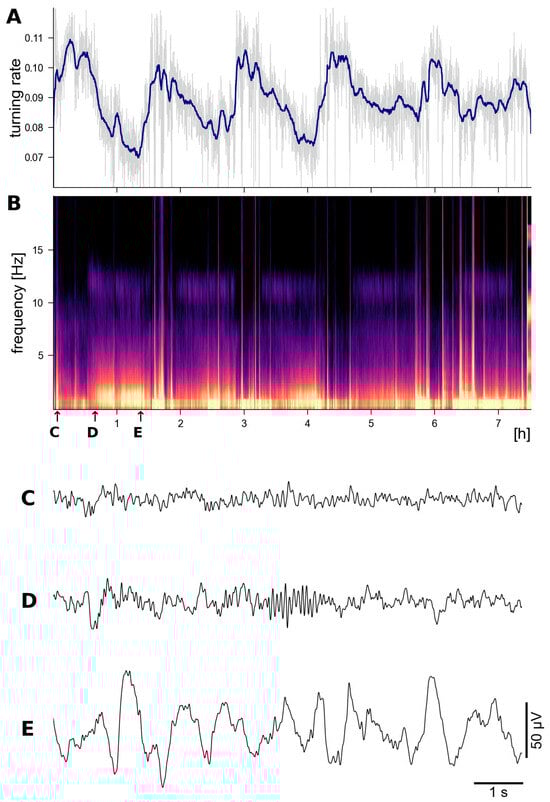 Night-long recording with ULTEEMNite in a healthy 53-year-old proband clearly reveals the typical macro-and microstructure of sleep EEG. In (A), the recorded EEG signal is analysed by computing the turning rate, which is defined as the probability of all non-monotonous ordinal patterns of length 3 [24,25] for moving windows of 10 s duration (in light gray). The blue line represents results from applying a 5 min moving median filter. The turning rate was proposed as a computationally efficient and robust time-domain-based measure to assess sleep depth, i.e., the lower the turning rate, the deeper the sleep. (B) shows a multi-taper spectrogram [26,27], revealing the typical spectral dynamics and motifs of five sleep cycles, i.e., periodically recurring power increases in the 0.5–4 Hz and 10–14 Hz frequency ranges. Representative EEG time segments of 10 s duration are shown for the non-REM sleep stage N1 in (C), stage N2 in (D) with typical sleep spindles, and for stage N3 with larger amplitude and more regular delta activity in (E). The times when these EEG segments were recorded are indicated by the corresponding labels and small arrows in (B).