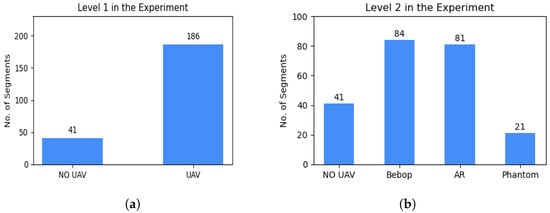Visual representation of the number of segments in level one and level two of the experiment. (a) First level with two classes (UAV, NO UAV). (b) Second level represents the presence of the UAV with three classes.