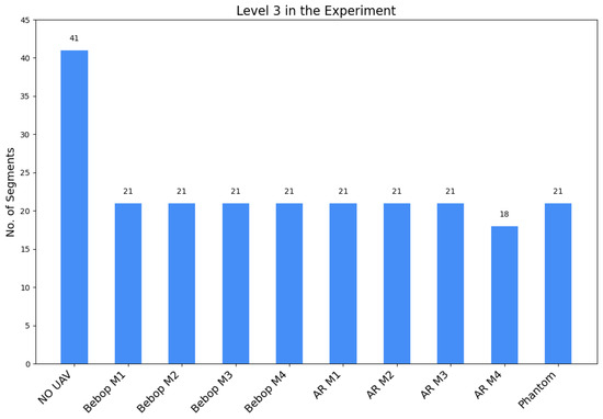This comprehensive dataset facilitates the detection of UAVs in the environment. It includes a wide range of RF activities, consisting of both RF background activities (representing situations when UAVs are not present) and RF drone activities (corresponding to scenarios with UAVs). Moreover, the dataset covers RF signals emitted by various UAVs operating in different flight modes. Many features inside these RF signals can be extracted and used as unique identifiers including the frequency patterns, modulation techniques, signal strength, and other relevant parameters. This enables not only UAV identification but also the determination of the flight mode of intruding UAVs, such as hovering, flying, and recording videos. Within the dataset, there are recorded segments available in their raw format for each class, obtained through multiple experiments. In terms of specific durations, the RF background activities are recorded for approximately 10.25 s, while the RF communication for each flight mode of the UAV has a duration of roughly 5.25 s. To conserve memory, the RF signals are saved as segments in a standard CSV file format. The recorded segments were categorized into three levels, resulting in a total of 227 segments, each of samples. Figure 2 and Figure 3 provide a visual representation of the number of segments of each level of the experiments. The three levels in the dataset are listed below: