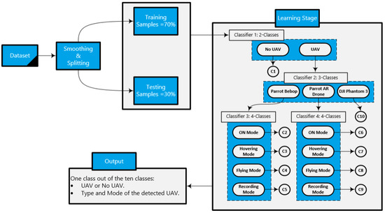 Based on the dataset’s preceding description [32], a hierarchical approach can be used to solve the detection and identification challenge by treating it as a multi-class classification problem. Previous research proposed a state-of-the-art approach that has shown great accuracy results in detection and identification. They constructed a hierarchical detection and identification system using ensemble learning with decision trees [24]. Our system implements the same hierarchy using four classifiers to determine the existence of the UAV, its model, and how it is being operated.