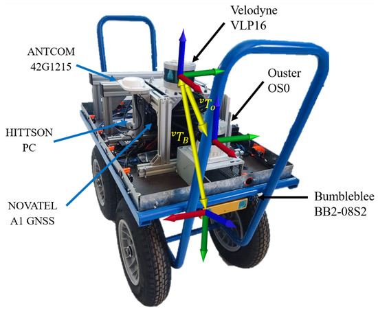 Sensor-equipped platform used to acquire data, equipped with a Bumblebee stereo camera, Novatel GNSS (Calgary, AB, Canada), ANTCOM 45G1215 (Torrance, CA, USA), a Velodyne VLP16 3D LiDAR, and an Ouster OS0 LiDAR with an IMU. Also, a map of reference of local systems for platform sensors is shown. The x-axis is represented in red, the y-axis in green, and the z-axis in blue.