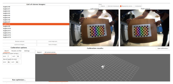 The intrinsics of the stereo camera were determined with the kinect-stereo-calib application from the Mobile Robot Programming Toolkit (MRPT) [50], including the focal lengths , the optical centers , the pin-hole distortion parameters , and the left-to-right relative pose. Calibration was performed using a 7 × 10 classic checkerboard target pattern, capturing 20 pairs of images. The calibration file is available online. An example of the calibration tool, showing the result, is shown in Figure 2.