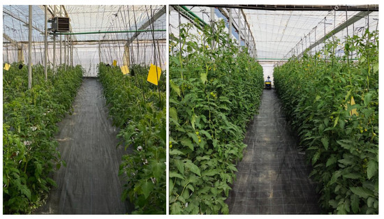 The greenhouse crop is tomato (Lycopersicon esculentum), and the plants are grown in coir bags in rows oriented from north to south with a slope of 1%, as shown in Figure 4.