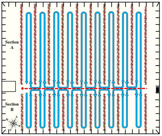 The trajectory that was followed through the crop is shown in Figure 5. In order to distinguish the longer corridors from the shorter ones, the greenhouse was segmented into two sections, dividing it by the central corridor.