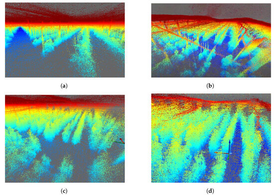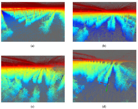 The 3D mapping of the IFAPA greenhouse with Ouster OS0. (a) Ouster MOLA Lidar odometry 2022-10-14. (b) Ouster MOLA Lidar odometry 2022-10-26. (c) Ouster MOLA Lidar odometry 2022-11-09. (d) Ouster MOLA Lidar odometry 2022-11-30.