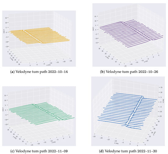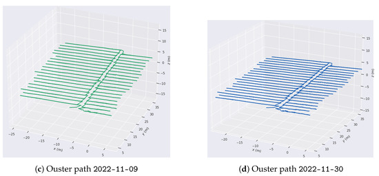 Path followed on different days with the Ouster OS0 with a jet-type color intensity.