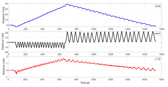 A higher point cloud density can be observed, as this LiDAR has twice as many point cloud rings as the VLP-16. In the same way, each of the segmented axes is projected, exhibiting the same oscillatory behavior due to the uneven terrain.