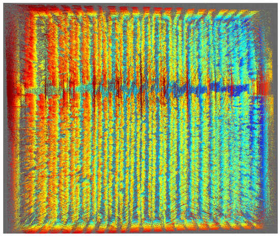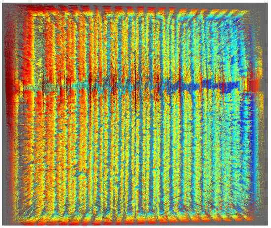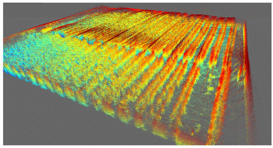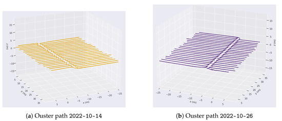 - Ouster OS0 LiDAR (San Francisco, CA, USA) (https://ouster.com/products/hardware/os0-lidar-sensor accessed on 10 March 2024): Data were also collected from the Ouster model OS0. This is a 32-channel LiDAR with a 360° horizontal and 90° vertical field of view, ranging between 0.3 m and 50 m. The data rate was also left at the default value of 10 Hz, including the onboard 6-axis IMU. This sensor was placed in a structure 20 cm lower than the Velodyne, obstructing its view and, hence, only collecting data with an effective horizontal field of view of 275°. The point cloud output of both LiDARs were stored together with the .bag mentioned in the stereo camera, accessed with the different tools in ROS.