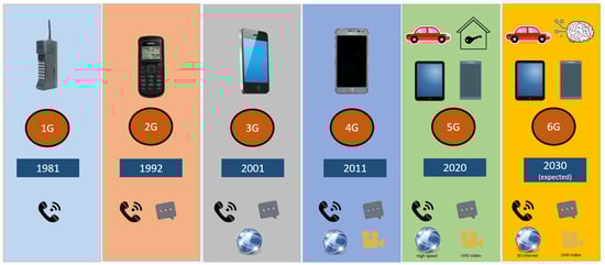 6G networks are currently being researched and developed as the next evolution of mobile networks, with the expectation of providing unparalleled transmission speeds, ultra-low latency, and improved coverage [25]. These networks will incorporate cutting-edge technologies such as terahertz communication, ultra-massive MIMO, AI, machine learning (ML), quantum communication, millimeter, reconfigurable intelligent surfaces, etc. Potential applications for 6G networks include Linked robotic and self-governing systems, wireless brain–computer interfaces, blockchain advancements, immersive multi-sensory realities, space and deep-sea exploration, tactile internet capabilities, and industrial networking. Figure 2 shows the evolution of mobile communications.
