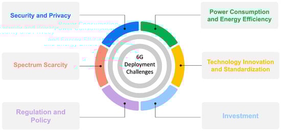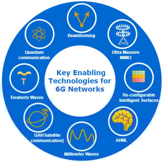 Anticipations suggest that 6G networks could debut around 2030, potentially emerging earlier in specific global regions. 6G wireless technology is currently the focus of research and development by several countries, universities, and tech companies worldwide. China has set an ambitious goal of dominating the 6G industry by 2030, and companies like Huawei, ZTE, and China Mobile are actively involved in 6G research [56,57,58,59]. In South Korea, LG has established a 6G research center [60], while Finland’s University of Oulu is leading 6G research with the country’s “6G Flagship” program [61]. The US Federal Communications Commission (FCC) has opened the “terahertz wave” for experiments on next-generation standards, which could include 6G. At the same time, companies like Qualcomm and Intel are also involved in 6G research [62]. Japan’s 6G research program focuses on developing technology for super-fast data transfer rates, and the EU’s Horizon 2020 5G-DRIVE project explores the potential of 6G [63,64]. However, despite the significant efforts being made, 6G technology is still in its early stages of development, and it may be some time before 6G networks become a reality.
